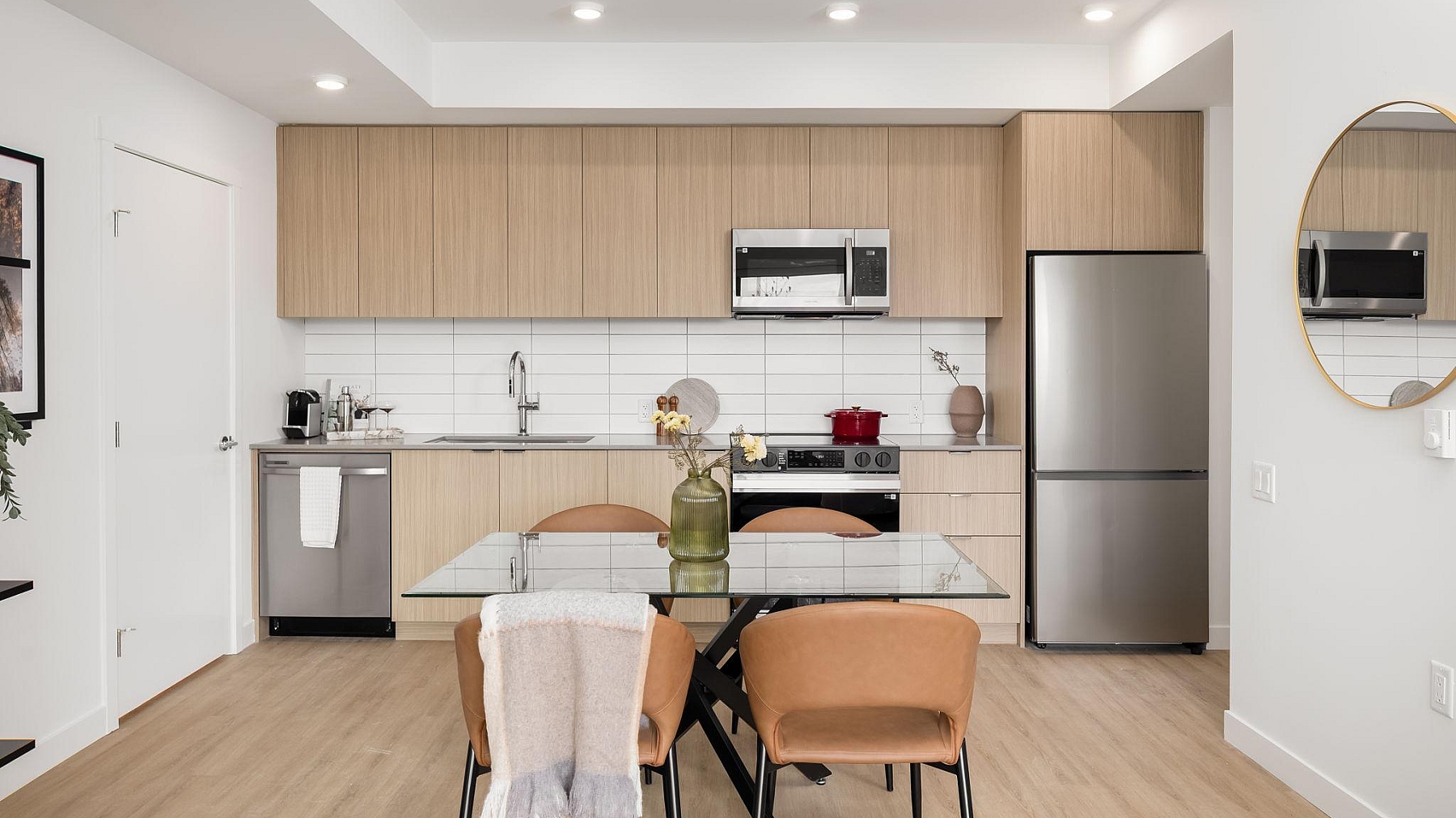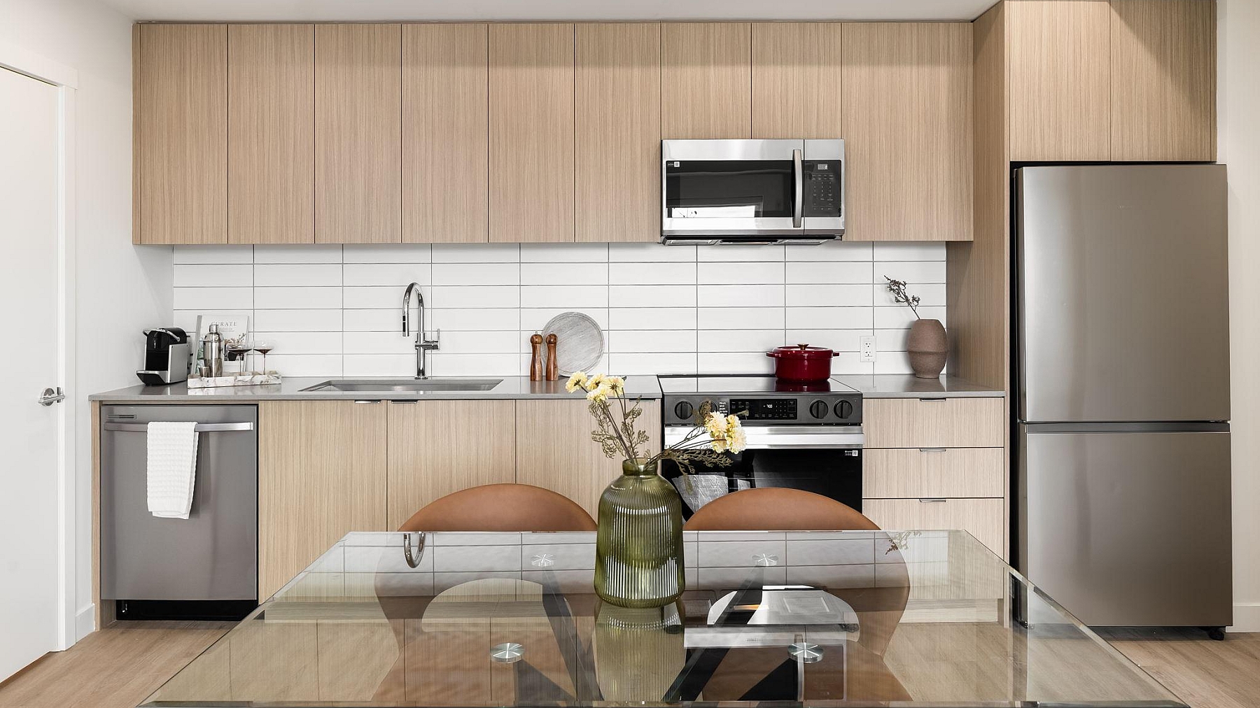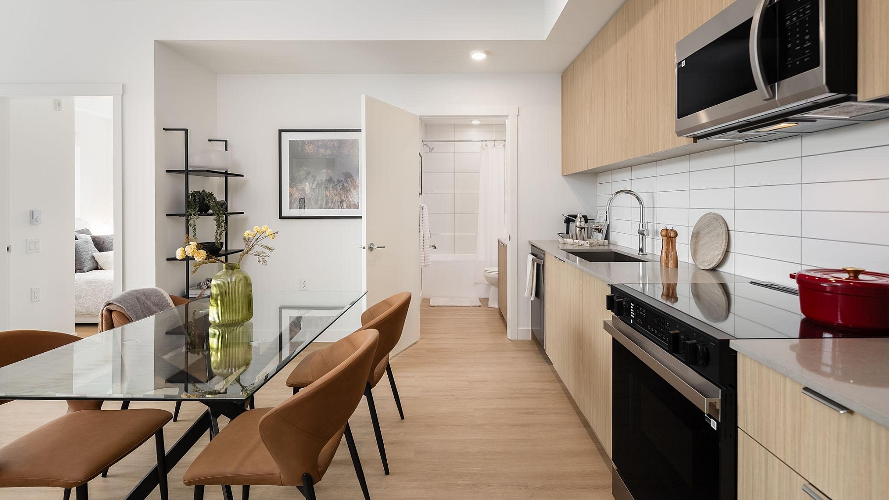 Open-concept layouts are thoughtfully planned to support both everyday living and easy entertaining. Durable flooring pairs modern style with long-lasting function, while kitchens feature contemporary cabinetry, sleek countertops, and high-quality appliances for a clean and cohesive finish. North-facing residences capture the city at its most iconic, a sightline framed by ocean and mountain vistas, while other homes are thoughtfully oriented toward the natural privacy of the Arbutus Greenway or the surrounding low-rise, tree-lined residential neighbourhoods.